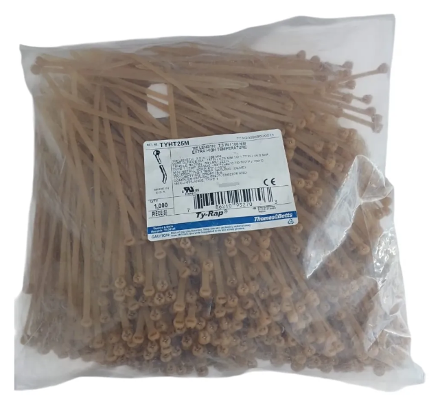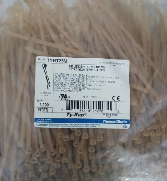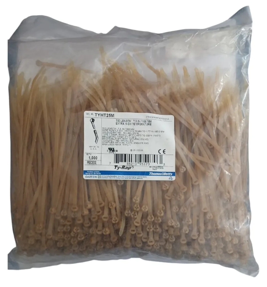 ABRAÇADEIRA ENFORCA GATO RESISTENTE A ALTAS TEMPERATURAS EM NYLON 4,6X186mm MODELO: TYHT25M MARCA: THOMAS e BETTS PARA TEMPERATURAS ATÉ 150° COMPRIMENTO: 186mm LARGURA: 4,7mm ESPESSURA: 1,5mm RESISTENTE A TRAÇÃO 222 NEWTONS